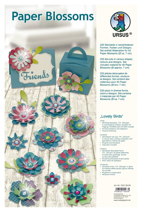 Set content: instructions, 220 flower cut pieces 110 - 200 g/m² (21 x 31.4 cm), all parts punched, in various sizes, 40 gemstones and half pearls